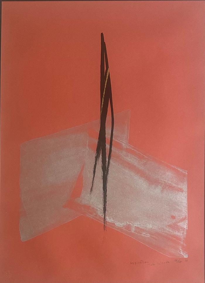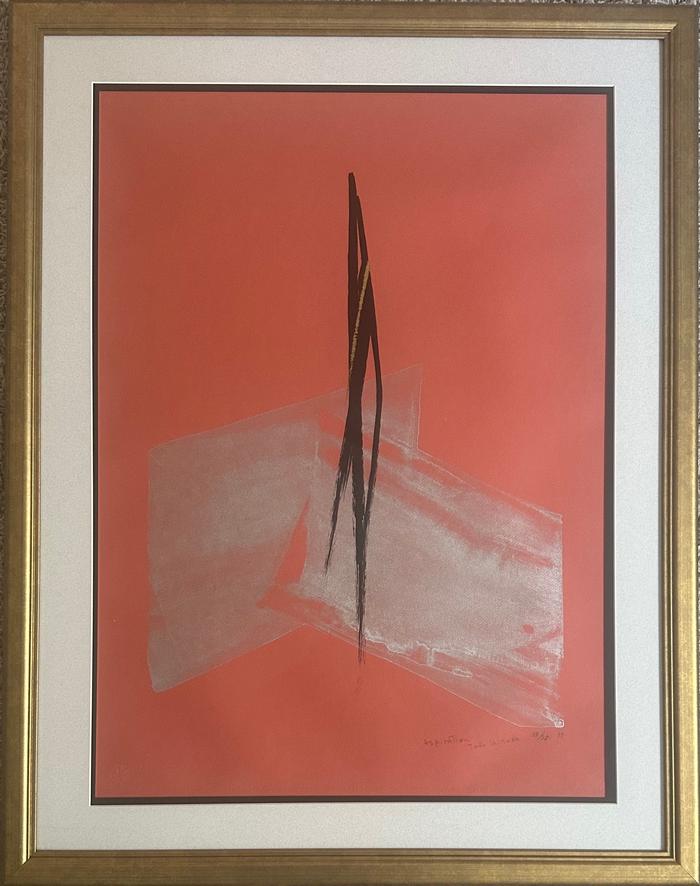 Description: An rare and iconic Work by the Artist on a russet lithographed background with gold hand applied ink. The print is framed in gold wood with a black and white double mat complimenting the modern aesthetic.The Artist produced very few designs on Russet.