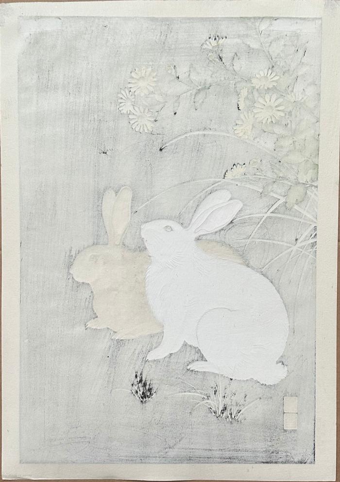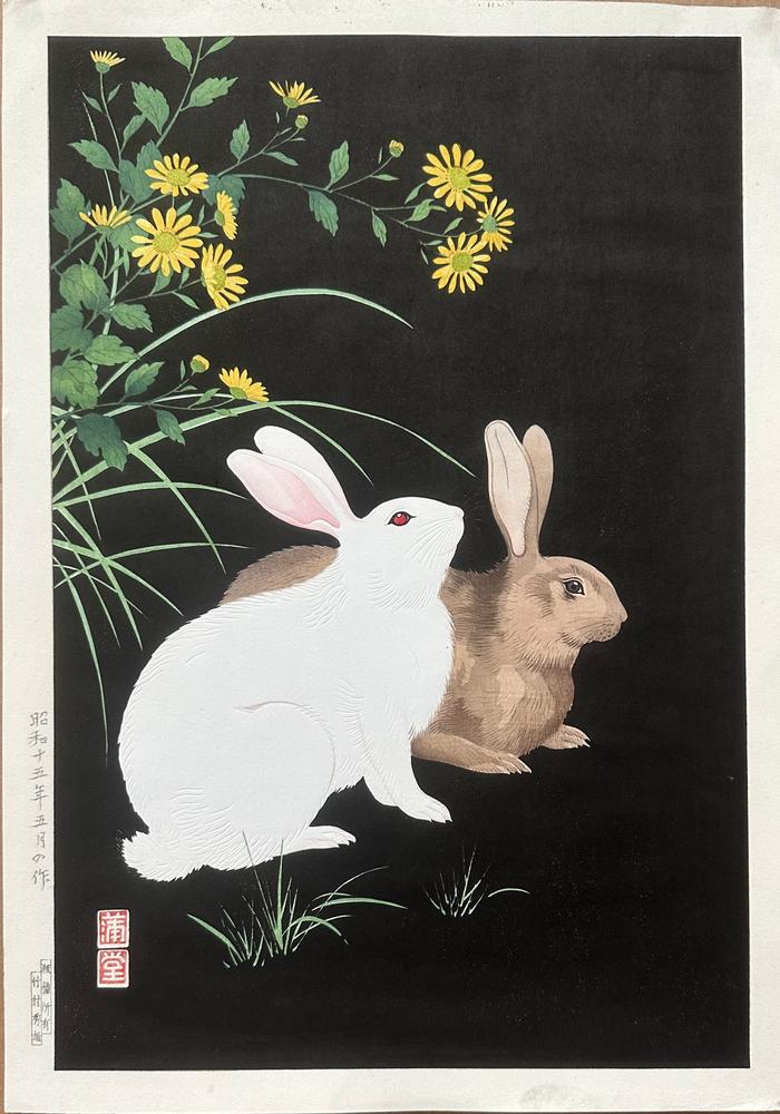 Description: Black and white rabbits on a rich black background with wild chrysanthemums. From a fine European Collection.