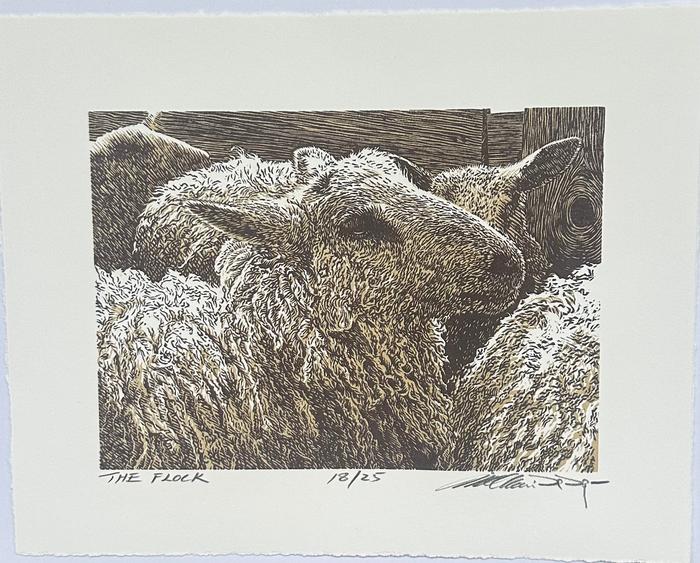 Description: The artist comments on this design :"Each spring, the flock is gathered to be shorn of their heavy winter coats. The tufts and curls of the sheep’s wool fascinated me and this small linocut print in two colors is the result. I thought that it would be a one-color print initially but the second color came into the picture as the weeks of careful carving took shape".